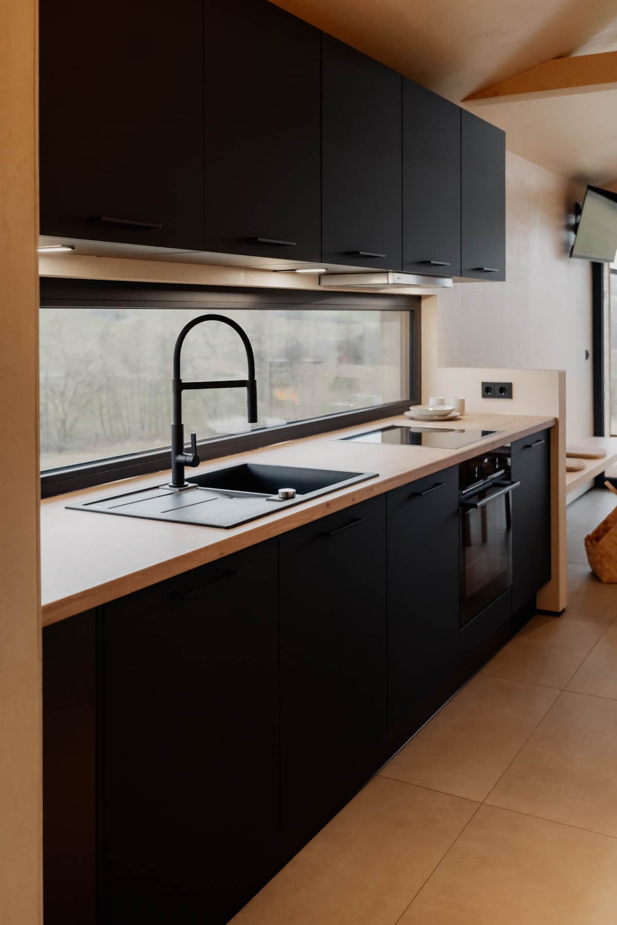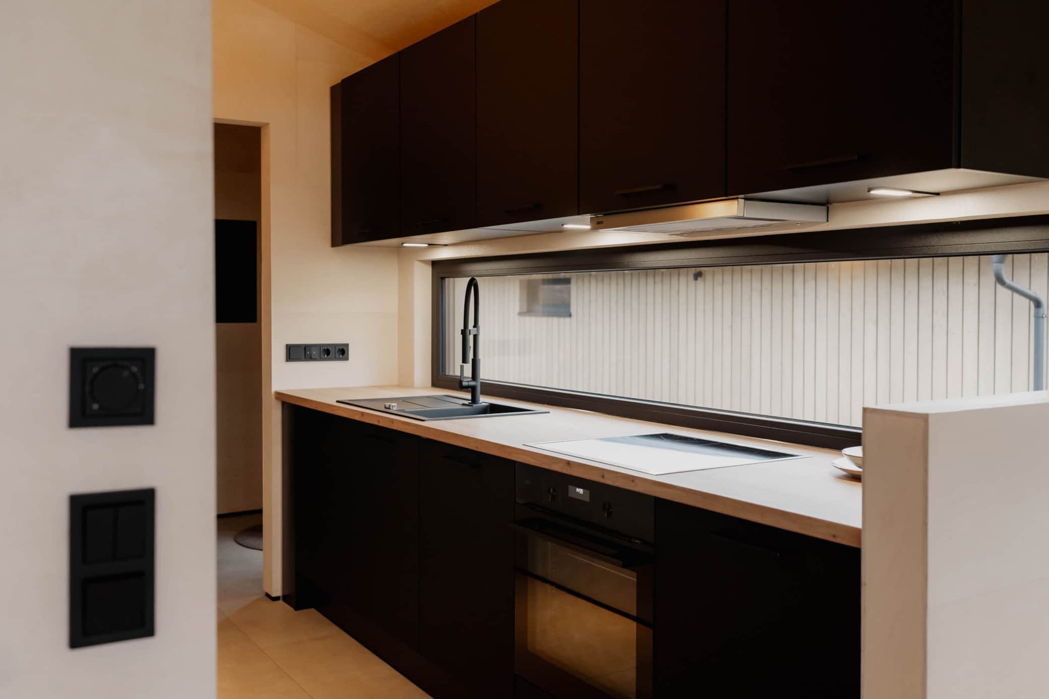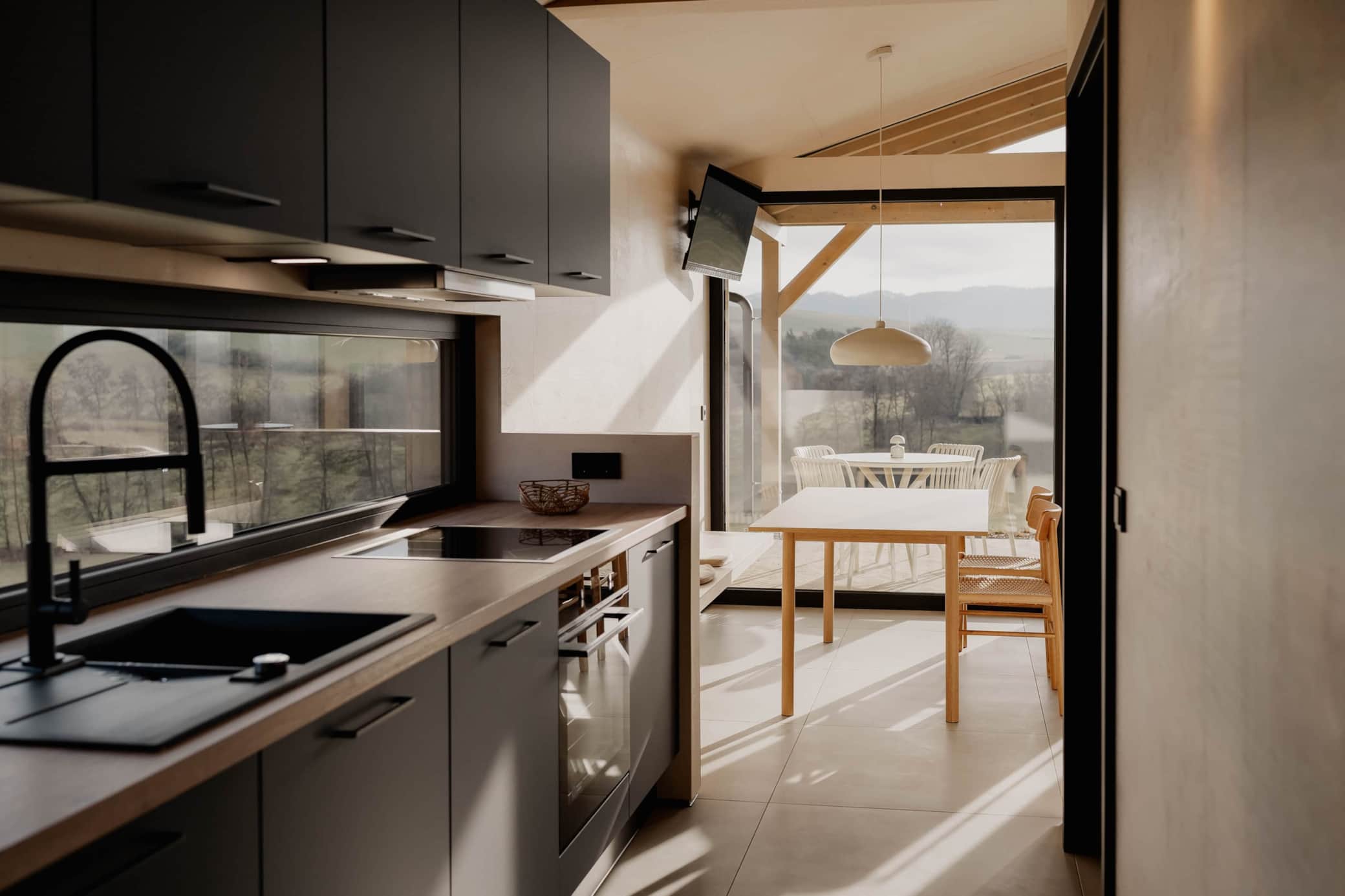 Die großzügige Glasrückwand lässt viel Licht in den Raum und verleiht der Küche eine offene, klare Atmosphäre. So wird jeder Moment am Herd zu einem kleinen Wohlfühlritual, das perfekt zum entspannten Charakter des Chalets passt.