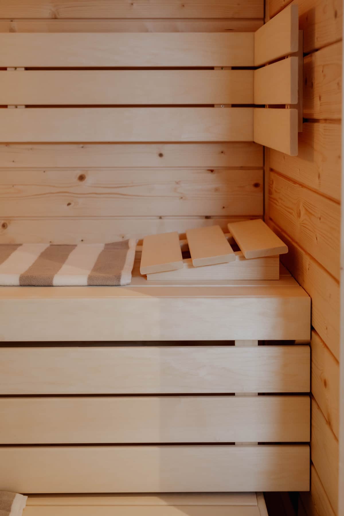 Die Trockensauna aus hochwertiger nordischer Fichte ist harmonisch im Badezimmer integriert und bietet einen wohltuenden Rückzugsort für entspannte Momente. Zwei komfortable Saunaliegen laden zum ausgiebigen Schwitzen ein, während die sanfte Beleuchtung eine ruhige, warme Atmosphäre schafft. Die Aufgusssteine ermöglichen intensive, aromatische Saunagänge ganz nach persönlichem Geschmack. Durch die große Glasfront wirkt der Raum offen und modern und verleiht dem Saunaerlebnis eine besondere, stilvolle Note.