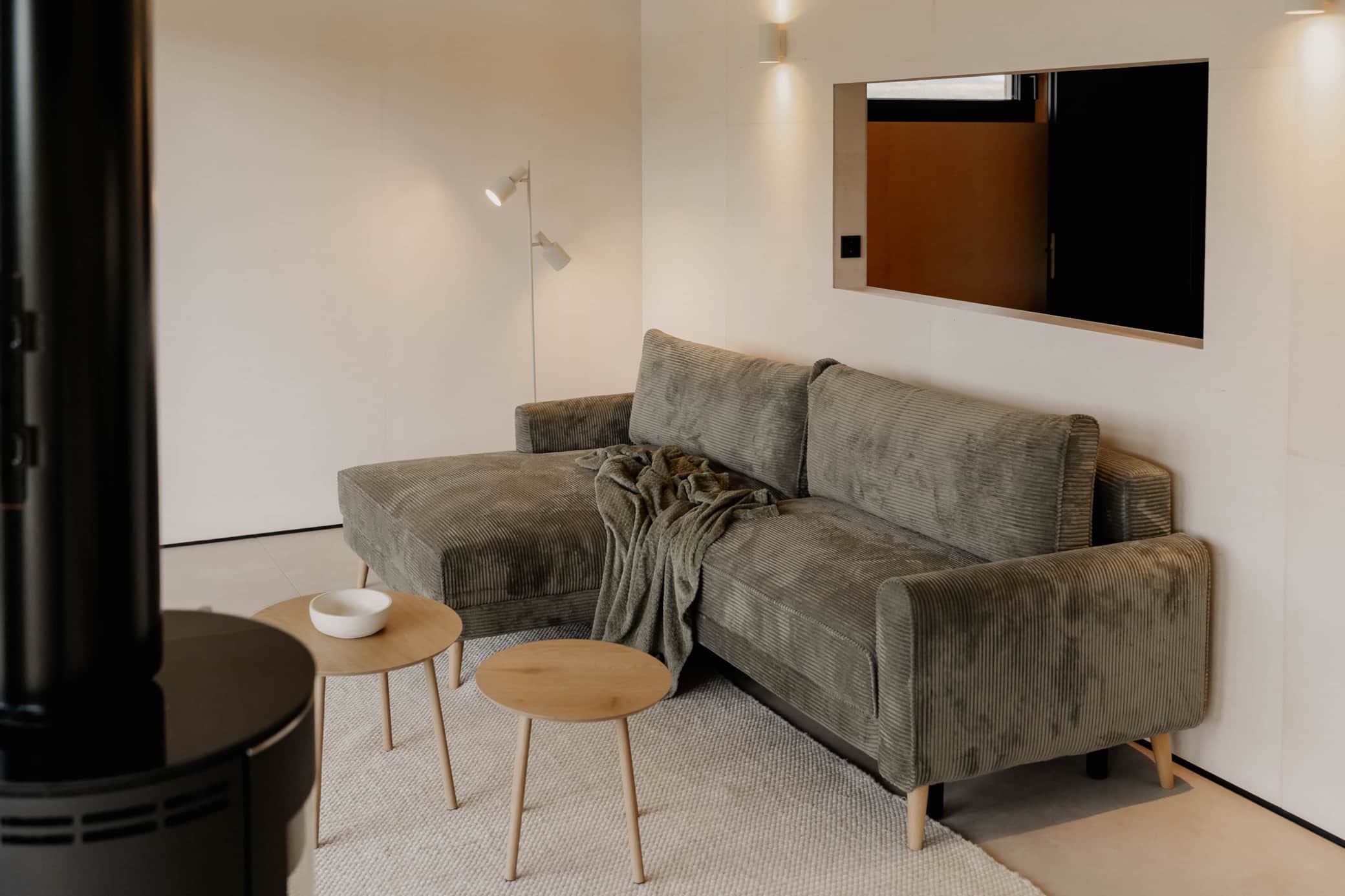 Zusätzlich steht ein komfortables Ecksofa bereit, das sich mit einer Aufbettung in eine Schlafmöglichkeit für einen dritten Erwachsenen oder zwei Kinder verwandeln lässt (Liegefläche 120 × 200 cm). Direkt vor der Terrassenglasfront gelegen, bietet es einen wunderbaren Ausblick und wird so zu einem besonders schönen Ruheplatz für Lesestunden oder kleine Auszeiten.