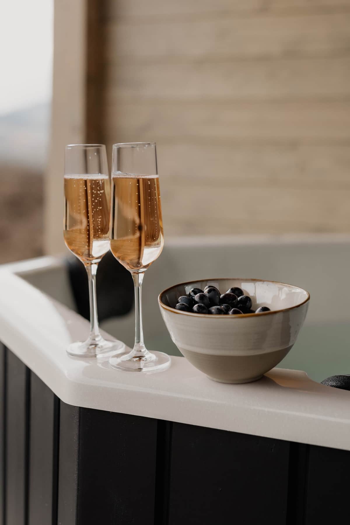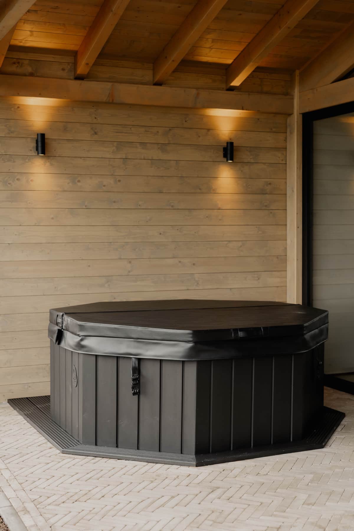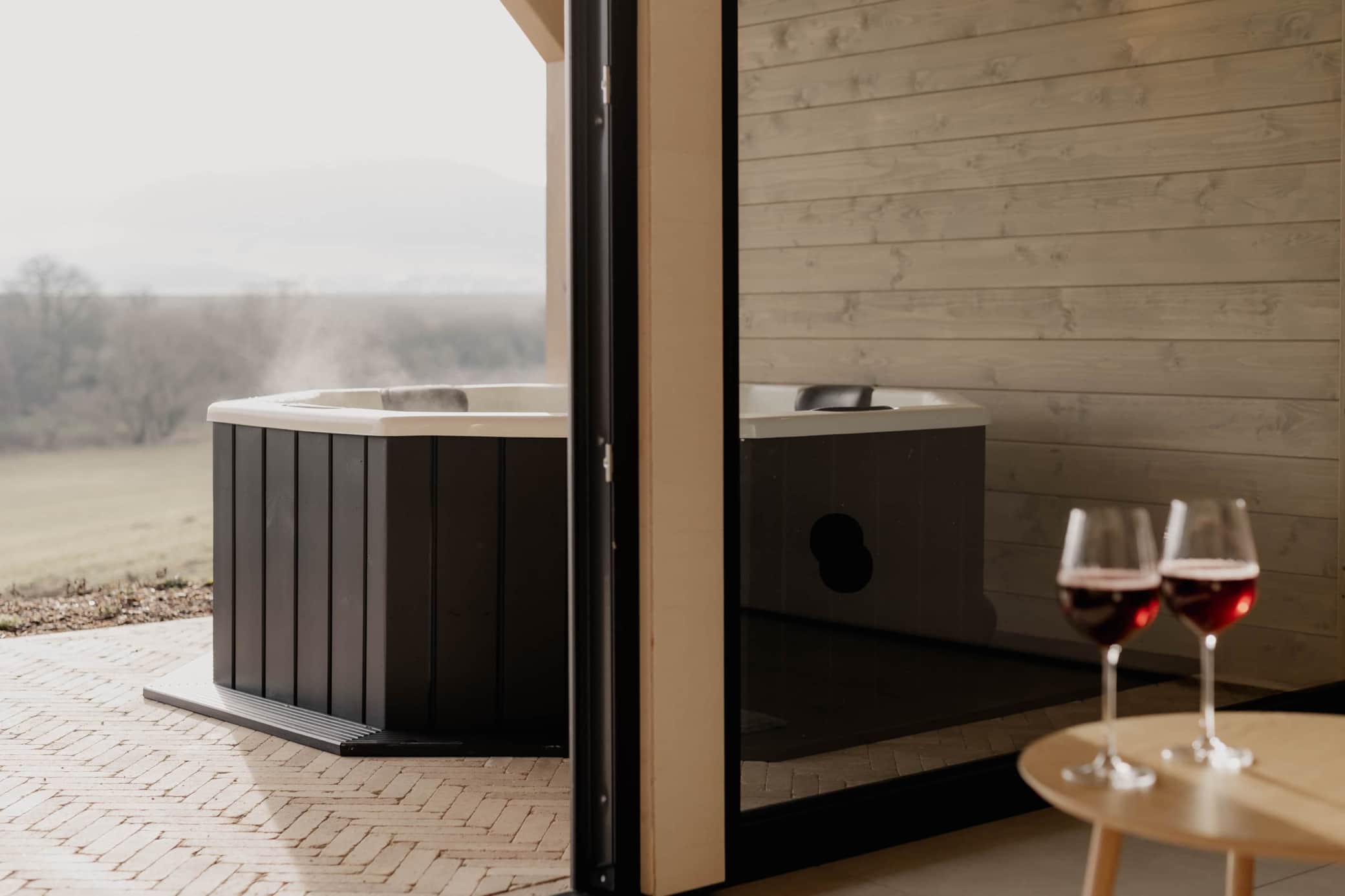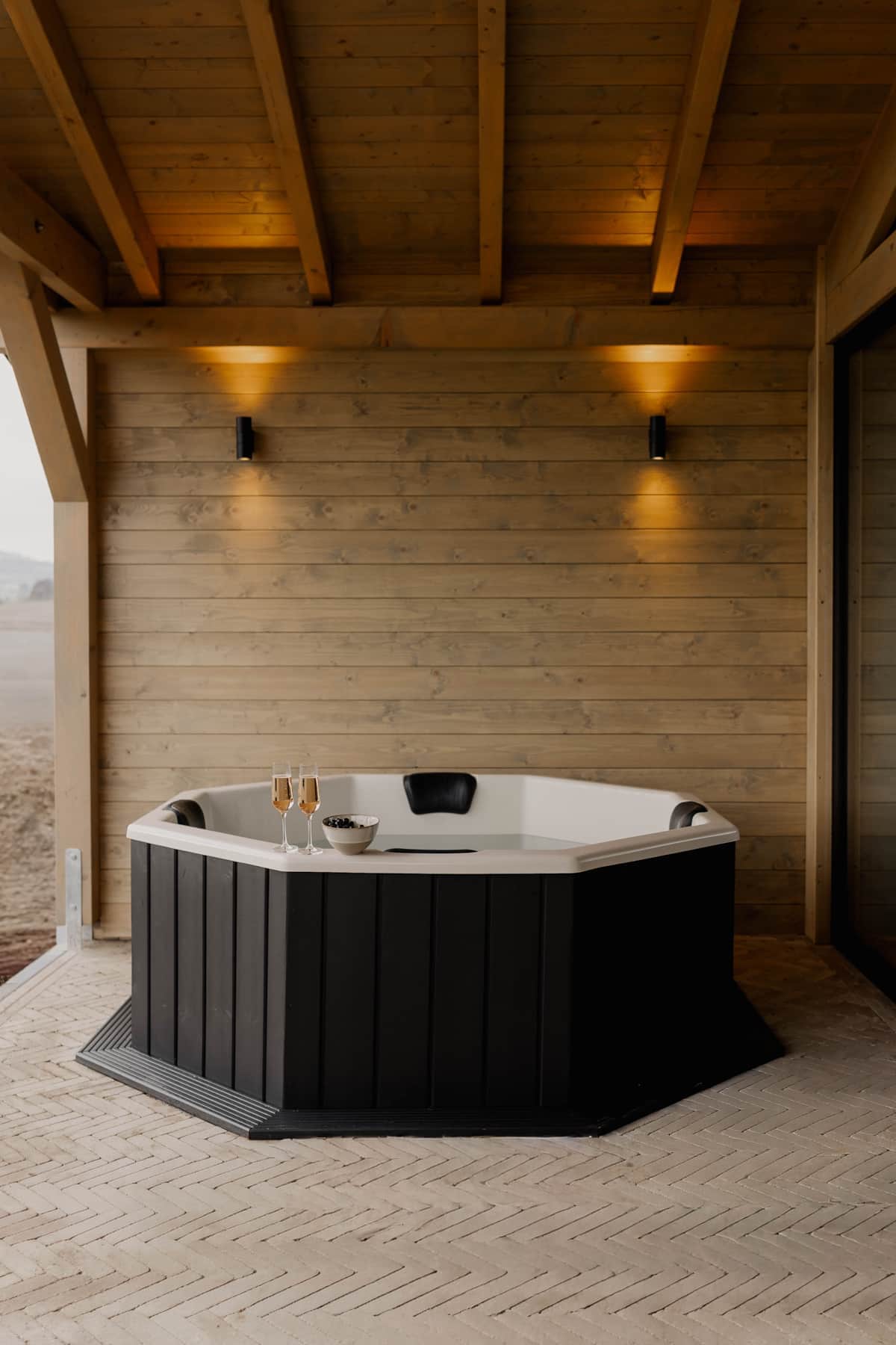 Alle Hüttenchalets verfügen über einen stimmungsvoll beleuchteten Badezuber auf der rund 20m² großen Terrasse. Dieser ist überdacht und windgeschützt, sodass er bei jedem Wetter ein wohliges Badeerlebnis bietet. Der Zuber hält dauerhaft eine angenehme Wassertemperatur von 38 Grad und bietet bequem Platz für bis zu vier Personen – inklusive großzügiger Beinfreiheit. Perfekt, um nach einem aktiven Tag in der Natur gemeinsam zu entspannen und die Wärme des Wassers zu genießen.